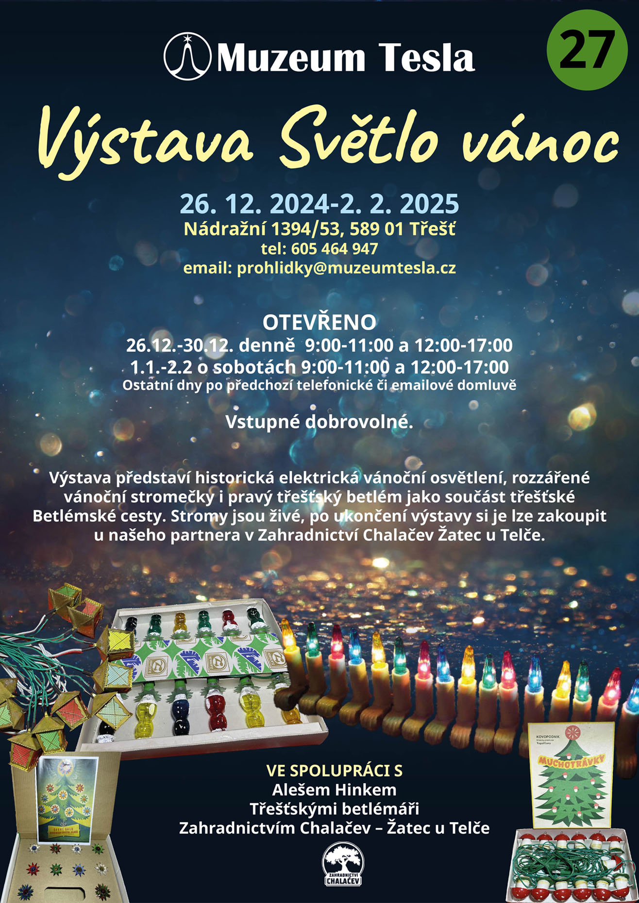 Novinky28. 4. 2025 „Radiotechnika z polí bitevních“ je název nové výstavy v Muzeu Tesla Třešť. V letošním roce slavíme osmdesáté výročí osvobození naší vlasti od německého nacismu. K této příležitosti připravil Historický radioklub československý, ve spolupráci s Klubem plastikových modelářů Jihlava, výstavu historické vojenské spojovací a bojové techniky. K vidění budou zařízení používaná Československou lidovou armádou (ČSLA), a to kořistní po wehrmachtu, či vyrobená licenčně v Československu. A protože výstava proběhne v Muzeu Tesla, bude především představena technika vyvinutá a vyrobená národním podnikem TESLA. Příznivci a členové Klubu plastikových modelářů Jihlava (KPM) výstavu doplnili ukázkou třírozměrných modelů bojové techniky, nechybí tematická dioramata či panely s podrobnými informacemi o konci války. Výstavu můžete navštívit jako součást prohlídkové trasy našeho muzea od čtvrtka 1. května až do konce letošní muzejní sezóny vždy v otevírací dny od 9 do 17 hodin. Pavel Boudný, spoluautor výstavy 26. 3. 2025 Vážení příznivci našeho muzea! Blíží se nám začátek letošní turistické sezóny a s ním i otevření našeho muzea. Přesto, že máme expozice již naleštěné a téměř připravené na Vaše návštěvy, musíme pro tentokrát otevření muzea posunout z důvodů náhlého onemocnění naší kolegyně průvodkyně až na sobotu 5.4. od 9 hodin. Dočasně bude také omezena provozní doba pouze na soboty. V případě zájmu ale bude možné po předchozí telefonické či mailové domluvě muzeum navštívit i během nedělí v době od 9 do 15 hodin a ve všední dny pak po 15. hodině. Omlouváme se za komplikace, přejeme brzké uzdravení naší kolegyni a těšíme se na Vaši návštěvu! Tým HRČS a muzea Tesla. 16. 12. 202 Vážení příznivci našeho muzea! Dovolujeme si Vás pozvat na první speciální vánoční výstavu ČS. historického elektrického vánočního osvětlení . Vánoční světýlka si budete moct prohlédnout na živých stromečcích, které nám pro výstavu zapůjčilo rodinné zahradnictví Chalačev Žatec u Telče a které si budete moci po skončení výstavy zakoupit. Součástí výstavy je také mimo vánočních světýlek vyřezávaný třešťský betlém pana Aleše Hinka. Díky třešťským betlémářům se výstava také stane součástí třešťské Betlémské cesty, zastavení číslo 27. Dovolujeme si Vám popřát pohodové a poklidné prožití Vánočních svátků a těšíme se na Vaši návštěvu! OTEVŘENO 26. 12. – 30. 12. denně 9:00 – 11:00 a 12:00 – 17:00 1. – 2. 2. o sobotách 9:00 – 11:00 a 12:00 – 17:00 Ostatní dny po předchozí telefonické či emailové domluvě 27. 9. 2024 Vážení návštěvníci, letošní návštěvní sezóna Muzea Tesla se chýlí ke konci a jeho dveře se pro veřejnost naposledy otevřou v sobotu 28. září. Další prohlídky budou možné jen po telefonické, nebo mailové domluvě. Děkujeme Vám za přízeň a podporu a budeme se na vás těšit opět na jaře příštího roku. Kolektiv Muzea Tesla. 11. 9. 2024 Vážení návštěvníci, srdečně Vás zveme na komponovaný přednáškový večer pod názvem Noc vědců, který se koná v pátek 27. 9. v Muzeu vysočiny Jihlava, pobočka Třešť (Schumpetrův dům). Jednu z přednášek na téma ,,Proměny televize" pro Vás připravili členové Historického radioklubu československého (Muzeum Tesla). Začátek v 16.30 hod, podrobný program naleznete zde: https://mvji.cz/akce/noc-vedcu-trest Současně, v době od 8-ti do 22 hodin bude otevřeno i Muzeum Tesla, včetně výstavy měřicí techniky. Na tuto prohlídku je vstup zdarma. 1. 9. 2024 Vážení příznivci! Dne 7.9. se v Třešti koná den otevřených památek kterého se účastní i naše muzeum. Máte tak v letošním roce jednu z posledních možností navštívit naše muzeum a v případě zájmu i naše depozitáře a nahlédnout tak za běžně zavřené dveře které ukrývají spoustu dalších skvostů našich sbírek. Těšíme se na Vás tedy v sobotu 7.9. v době od 9 do 17 hodin! Vstupné na tuto akci je zcela zdarma. |